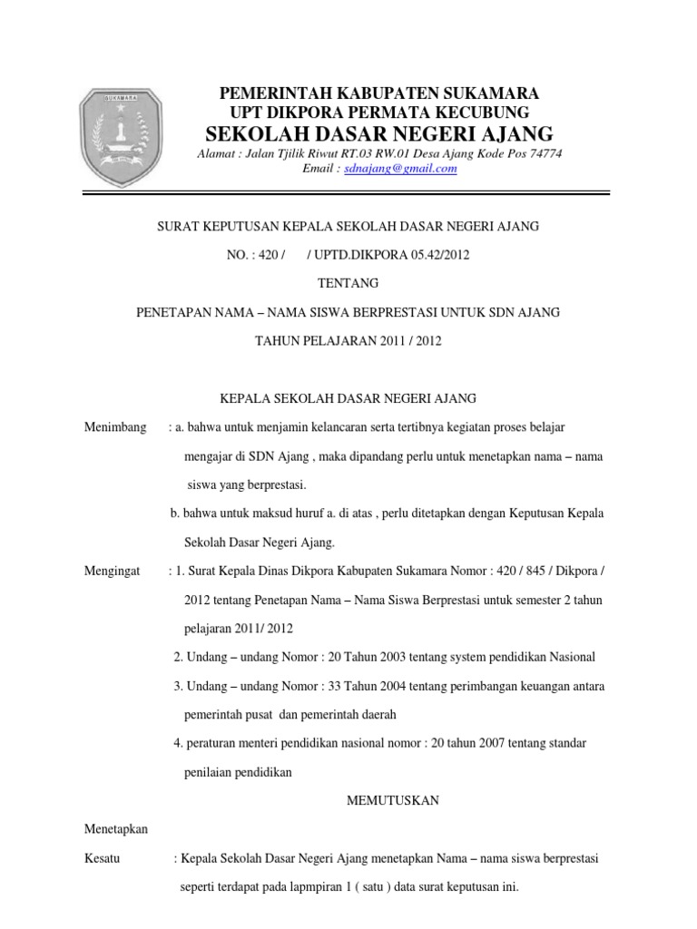 Keputusan ini berlaku mulai tanggal dikeluarkannya surat keputusan ini, dan apabila ternyata dikemudian hari terdapat perubahan, maka surat ini akan ditinjau kembali. Adapun surat keterangan ini dibuat dan diserahkan kepada dinas pendidikan kabupaten/kota dan dinas pendidikan provinsi terkait. Keputusan kepala sekolah tk lpm tunas kencana. Kelas xi sma negeri 1 medan. Menugaskan kpps sebagaimana dimaksud dalam diktum kesatu keputusan ini untuk mempersiapkan dan melaksanakan pemungutan dan peghitungan suara pemilihan kepala desa di tps serta. Posted on august 5, 2012 by cahyafrance. Contoh surat keputusan pengangkatan karyawan tetap. Contoh surat peminjaman barang sekolah. Contoh surat permohonan perubahan nama contoh surat keterangan siswa berprestasi tahun 2019. Contoh rekomendasi kuliah di arab saudi santri nabawi beasiswa. Kop surat yayasan darul falah. Pada postingan kali ini saya akan membagikan contoh surat keputusan penetapan juara pada lomba adzan, hafalan surat pendek dan baca puisi islam dalam acara peringatan maulid nabi muhammad saw yang diselenggarakan di dusun pulau beringin desa harapan kecamatan pondok kelapa. Walaupun telat posting setidaknya saya akan tetap berbagai contoh surat untuk sekolah yang akan melaksakan kegiatan kenaikan kelas di tahun pelajaran 2015/2016.